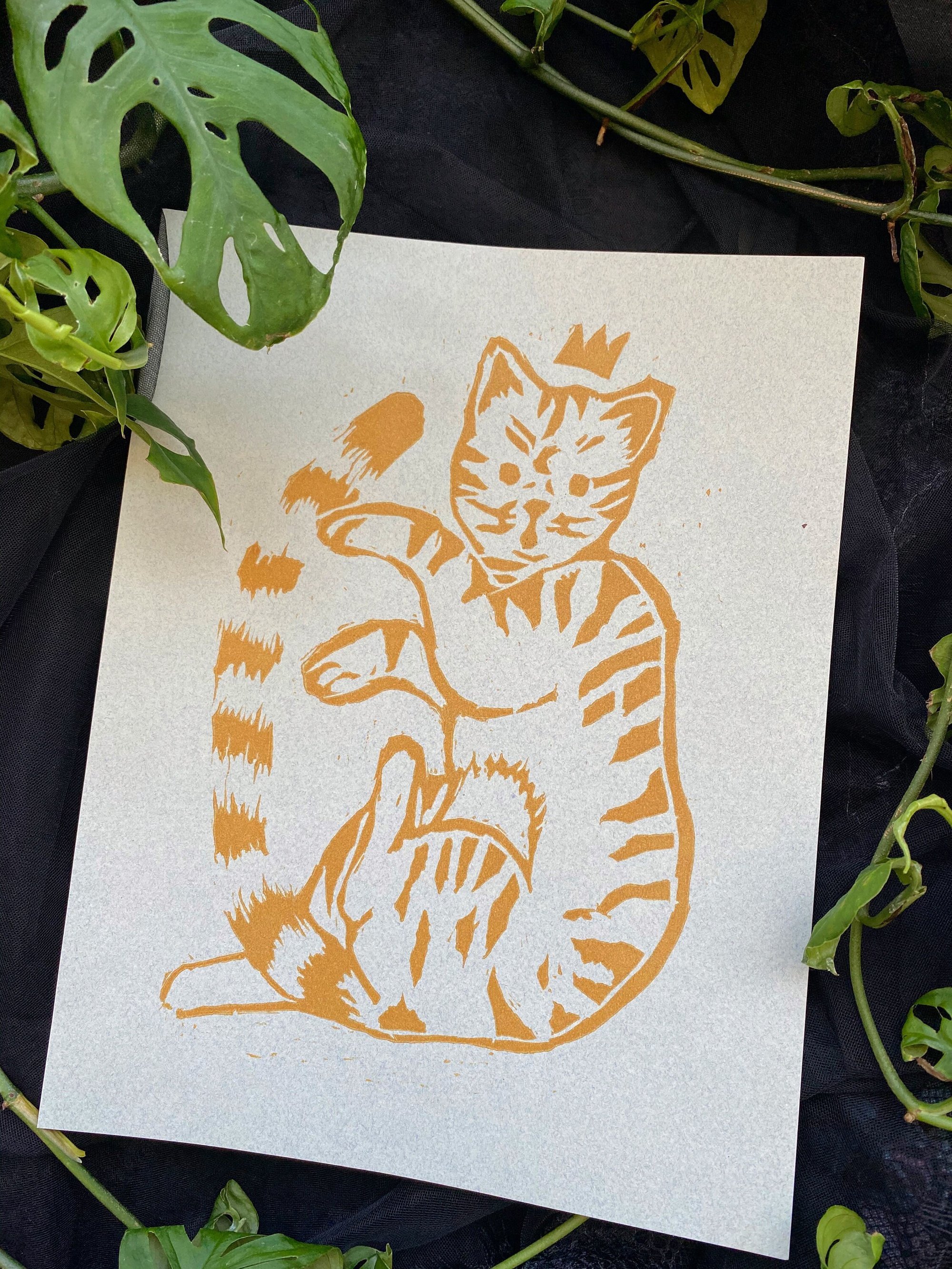 8.5X 10 inch Linoleum print made of my kitty cat Water based ink on high quality colored canson paper Each print is signed Will come with some goodies! Each print is slightly different